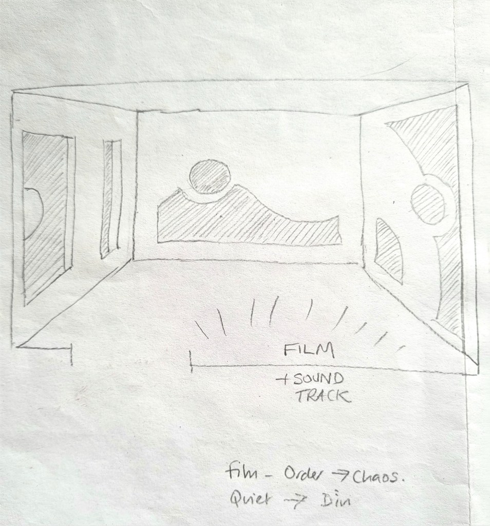 Early on I considered an alternative exhibition piece using greatly enlarged versions (floor to ceiling) of the prints Can’t You See That Less is More (sketch below) – but I decided that the braille work had more impact and nuance.