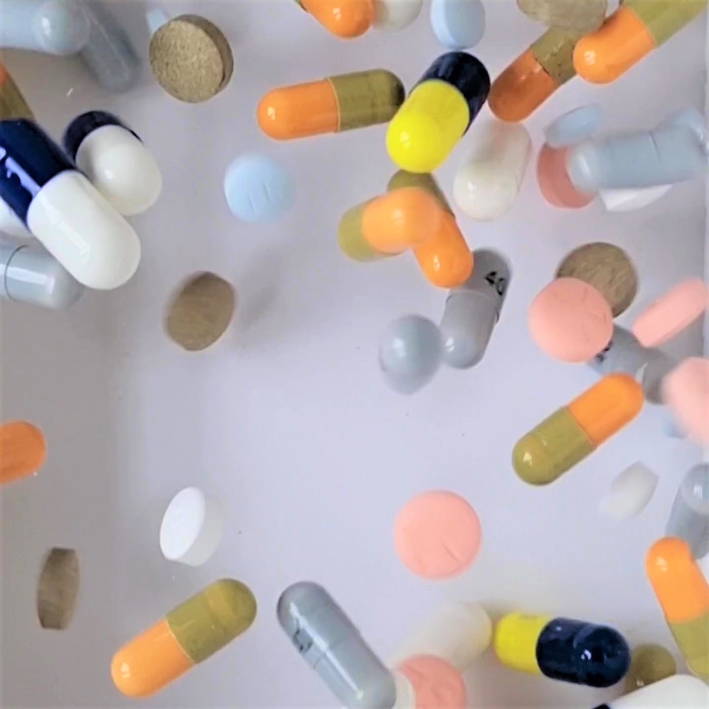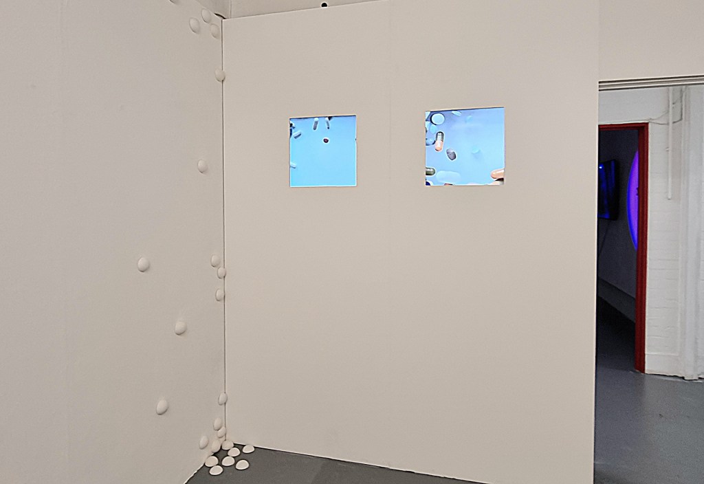 The wall installation is accompanied by two films playing on TV screens. Medication is displayed initially in an ordered tight layout – each type of medication in a neat line, one line of tablets below another line. As the film progresses the lines become disrupted and the structure begins to break down. Ultimately the whole structure breaks down in a violent destruction of the system and the ejection of all the tablets from the space. An angry response to the reality that the idealist ‘modernist’ aims of medicine – to improve life – can now result in the opposite.