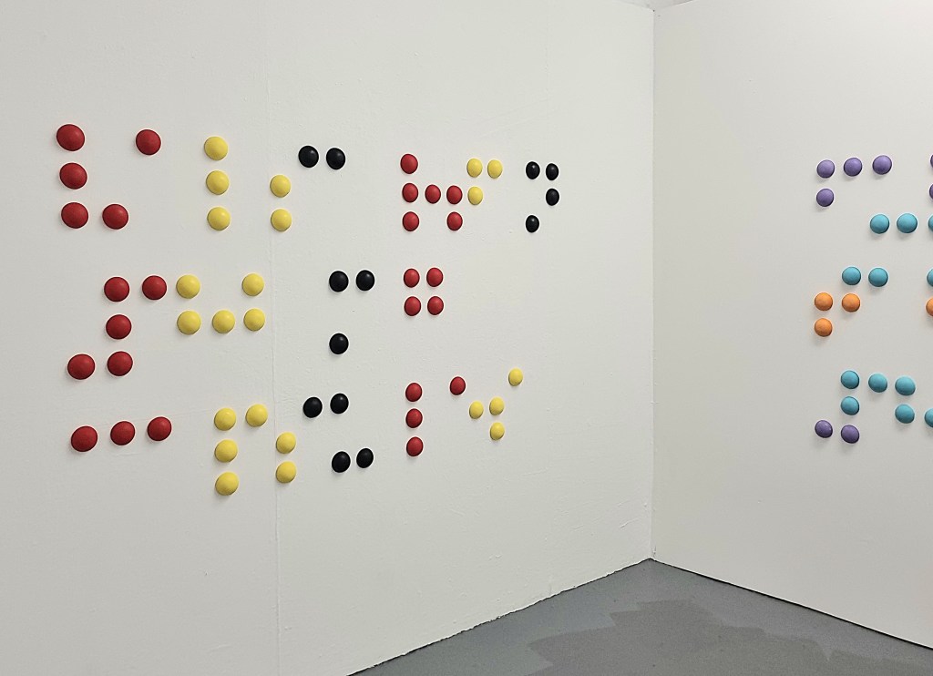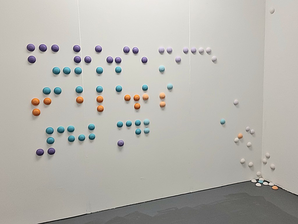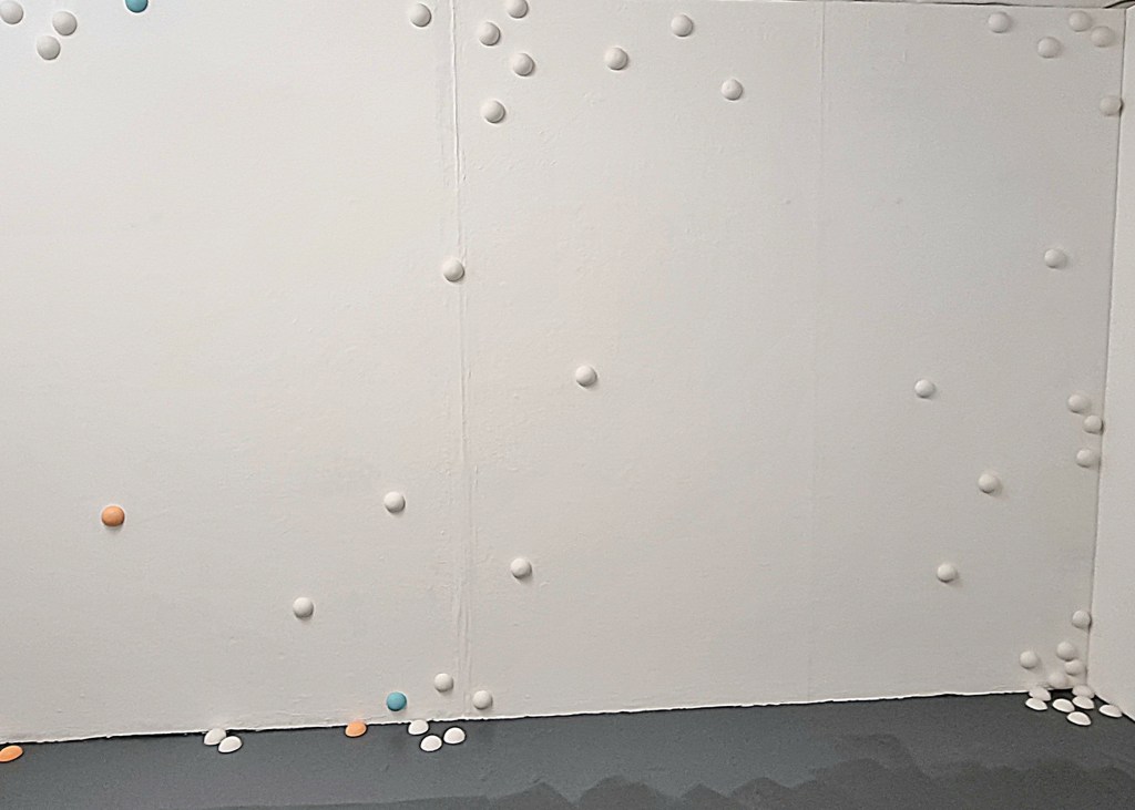 The Primum non nocere Wall Installation is extended, with the addition of a section that replaces the soothing colour palette with those associated with danger and warnings – yellow, red and black. The ordered geometric layout eventually starts to breakdown so that it starts to fall apart – quite literally falling to the floor. And the colours are faded out into eventual white. Both wall pieces are larger (involve more elements) than the previous installation. Again the pattern of the pieces is a faithful replication of the braille on medication packages – this time Valstartan and Furosemide.